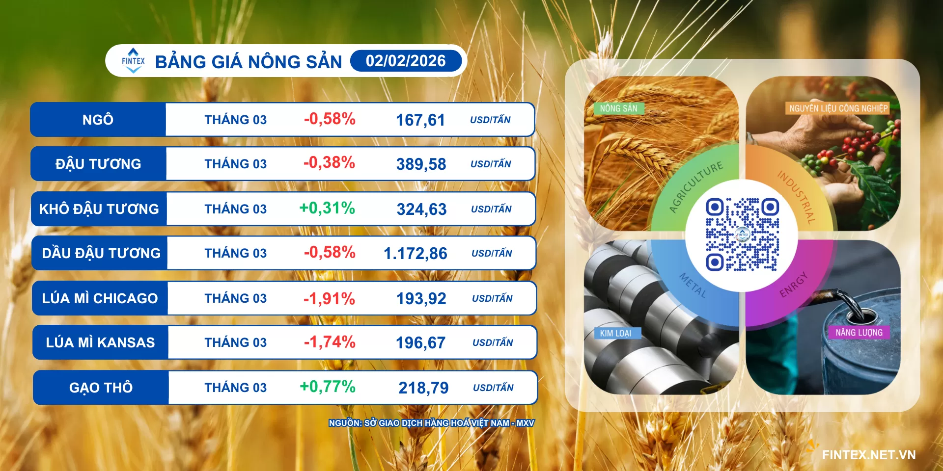 Không nằm ngoài xu hướng chung của thị trường, nhóm nông sản phiên hôm qua cũng chứng kiến lực bán áp đảo với 5 trên 7 mặt hàng đồng loạt đóng cửa trong sắc đỏ. Trong đó, hợp đồng lúa mì Chicago kỳ hạn giao tháng 3 đã giảm gần 2% chốt phiên tại mức 193,9 USD/tấn. Tương tự, hợp đồng lúa mì Kansas cùng kỳ hạn cũng đánh mất 1,74%, đóng cửa tại mức 196,7 USD/tấn.
