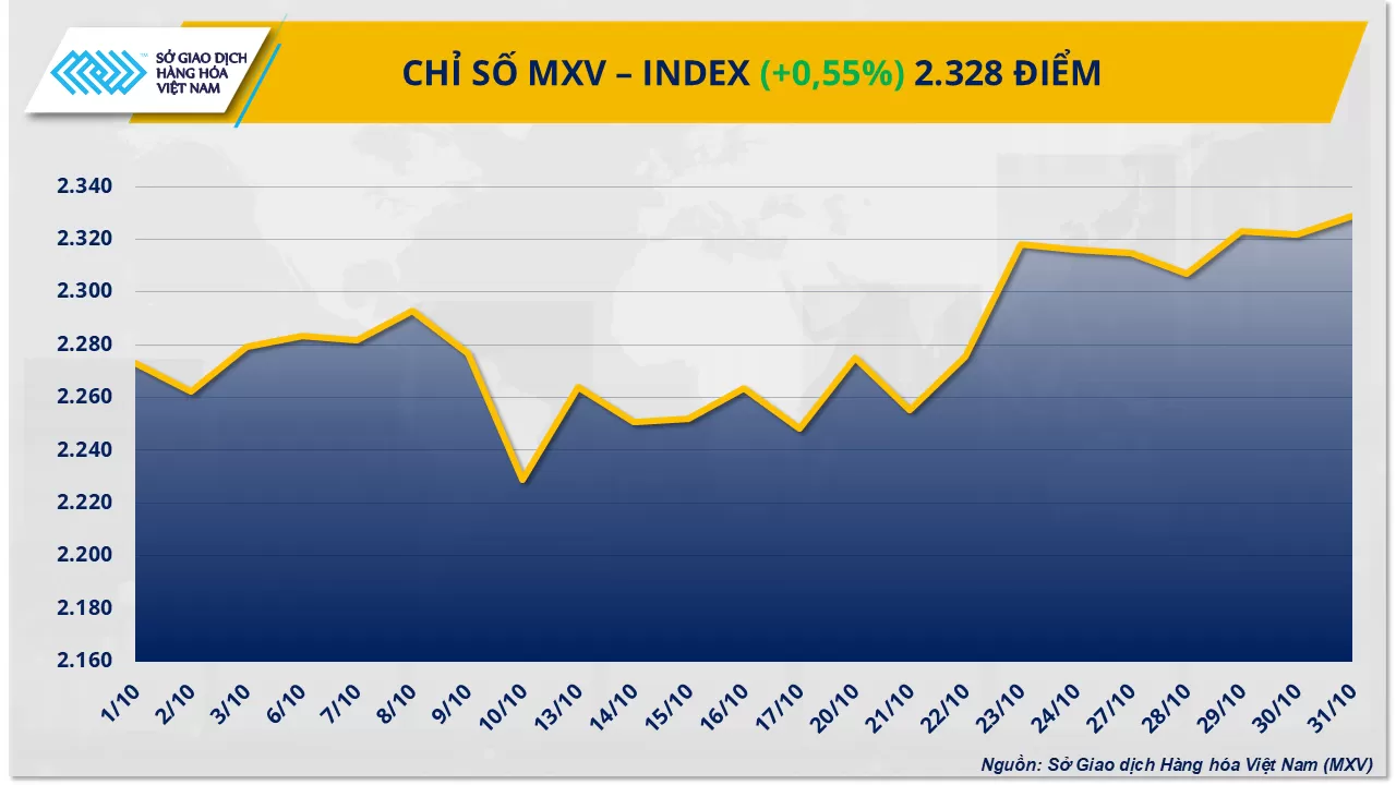 Trong đó, giá đậu tương tăng vọt gần 5,6%, còn khô đậu tương xác lập chuỗi 14 phiên tăng liên tiếp, kéo dài kỷ lục trong nhiều tháng qua. Lực mua chiếm ưu thế đã kéo chỉ số MXV-Index tăng hơn 0,5% so với tuần trước, lên 2.328 điểm.