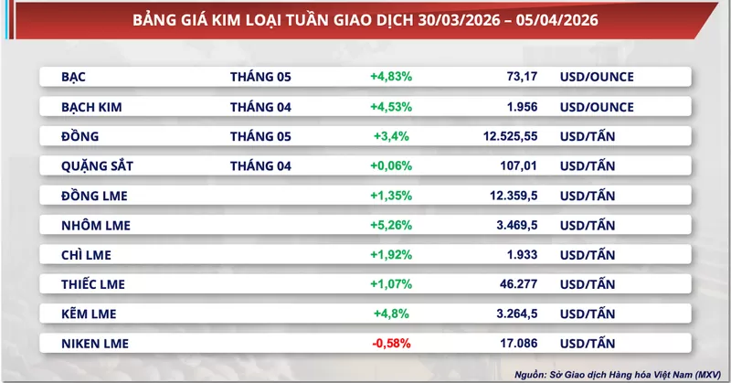 Đáng chú ý, nhiều mặt hàng ghi nhận mức tăng mạnh, trong đó bạc COMEX tăng 4,83%.