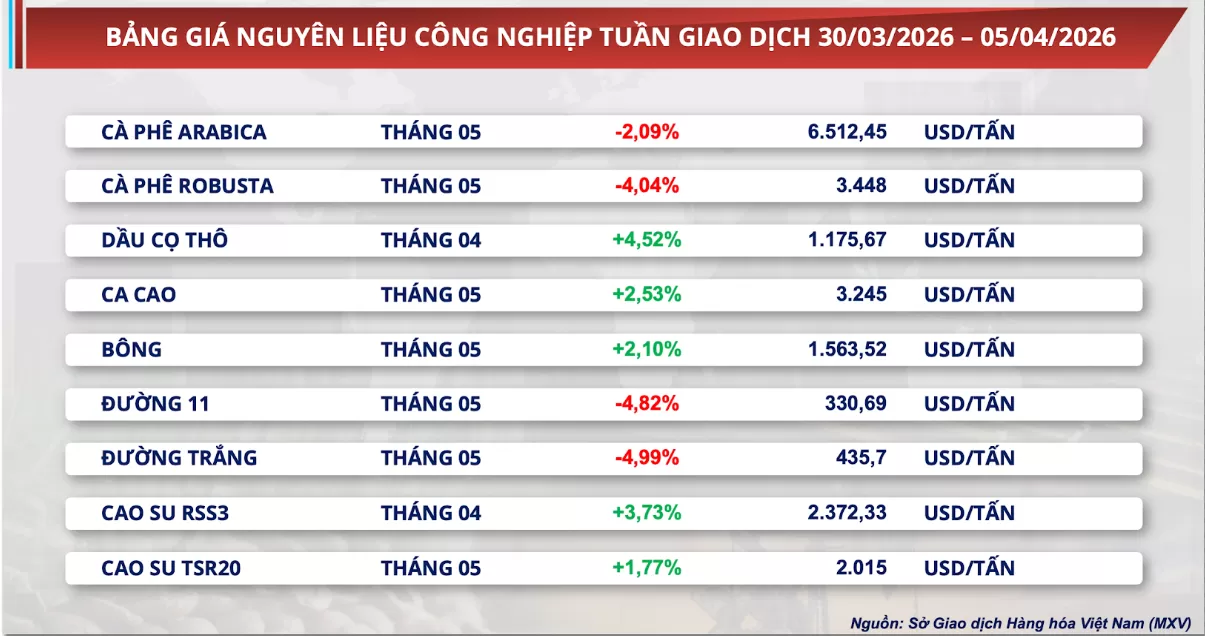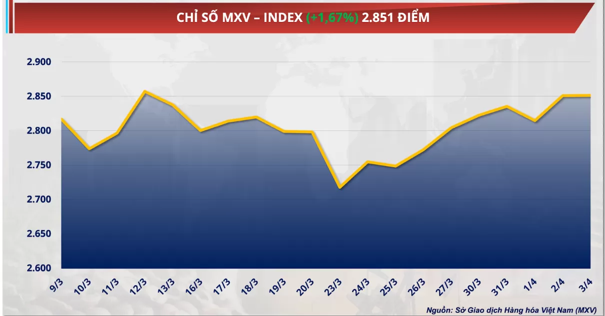 Thị trường hàng hóa nguyên liệu thế giới diễn biến giằng co trái chiều trong tuần giao dịch 30/3 - 3/4. Tuy nhiên, nhờ lực mua mạnh từ nhóm kim loại và năng lượng, chỉ số MXV-Index kết tuần tăng 1,67% lên 2.851 điểm.