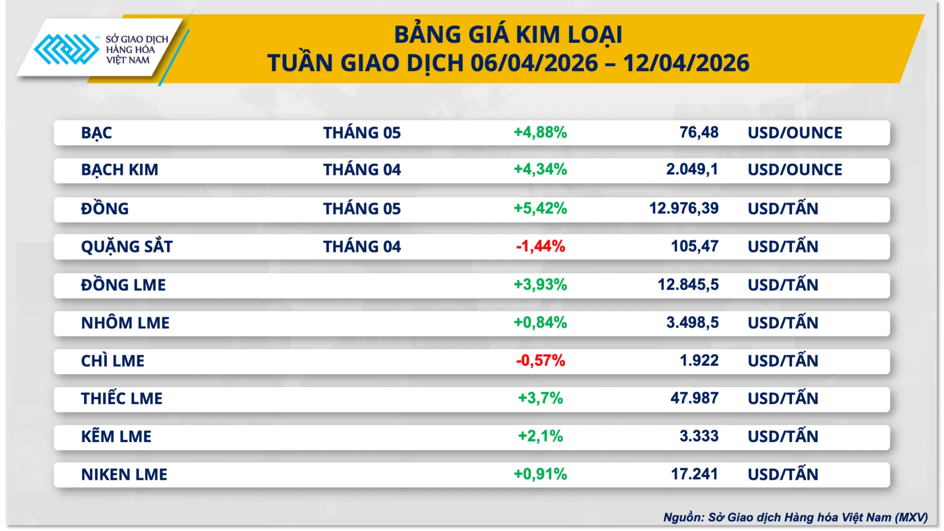 Trong khi đó, nhóm kim loại lại chứng kiến sự phục hồi mạnh mẽ của 8/10 mặt hàng, nổi bật là bạc COMEX với mức tăng tuần gần 5%, đạt mức cao nhất trong hơn ba tuần 76,5 USD/ounce.