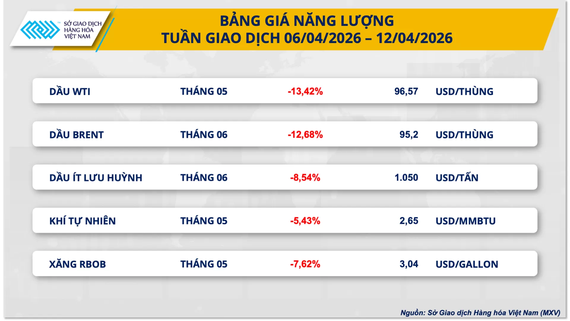 Kết thúc phiên ngày 10/4, giá dầu Brent dừng ở mức 95,2 USD/thùng, giảm tới 12,7% so với tuần trước - mức giảm sâu nhất kể từ tháng 8/2022. Dầu WTI cũng giảm 13,4%, rơi xuống 96,57 USD/thùng - mức giảm tuần mạnh nhất kể từ tháng 4/2020.