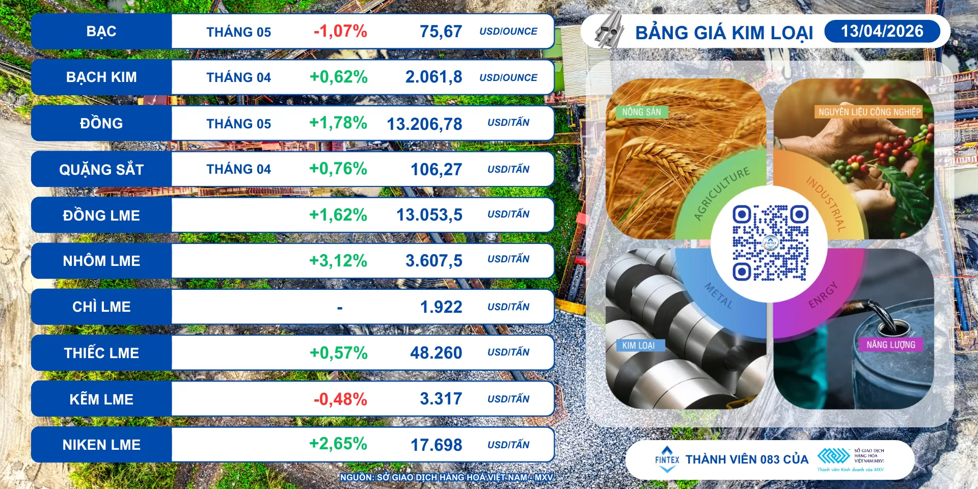 Sắc xanh áp đảo ở nhóm kim loại với 8/10 mặt hàng tăng giá tiếp tục góp phần kéo chỉ số MXV-Index bật tăng trong phiên. Điểm nhấn là đồng COMEX, khi tăng phiên thứ hai liên tiếp và vươn lên mức cao nhất kể từ cuối tháng 2. Kết phiên 13/4, giá đồng COMEX tăng gần 2% lên 13.207 USD/tấn.