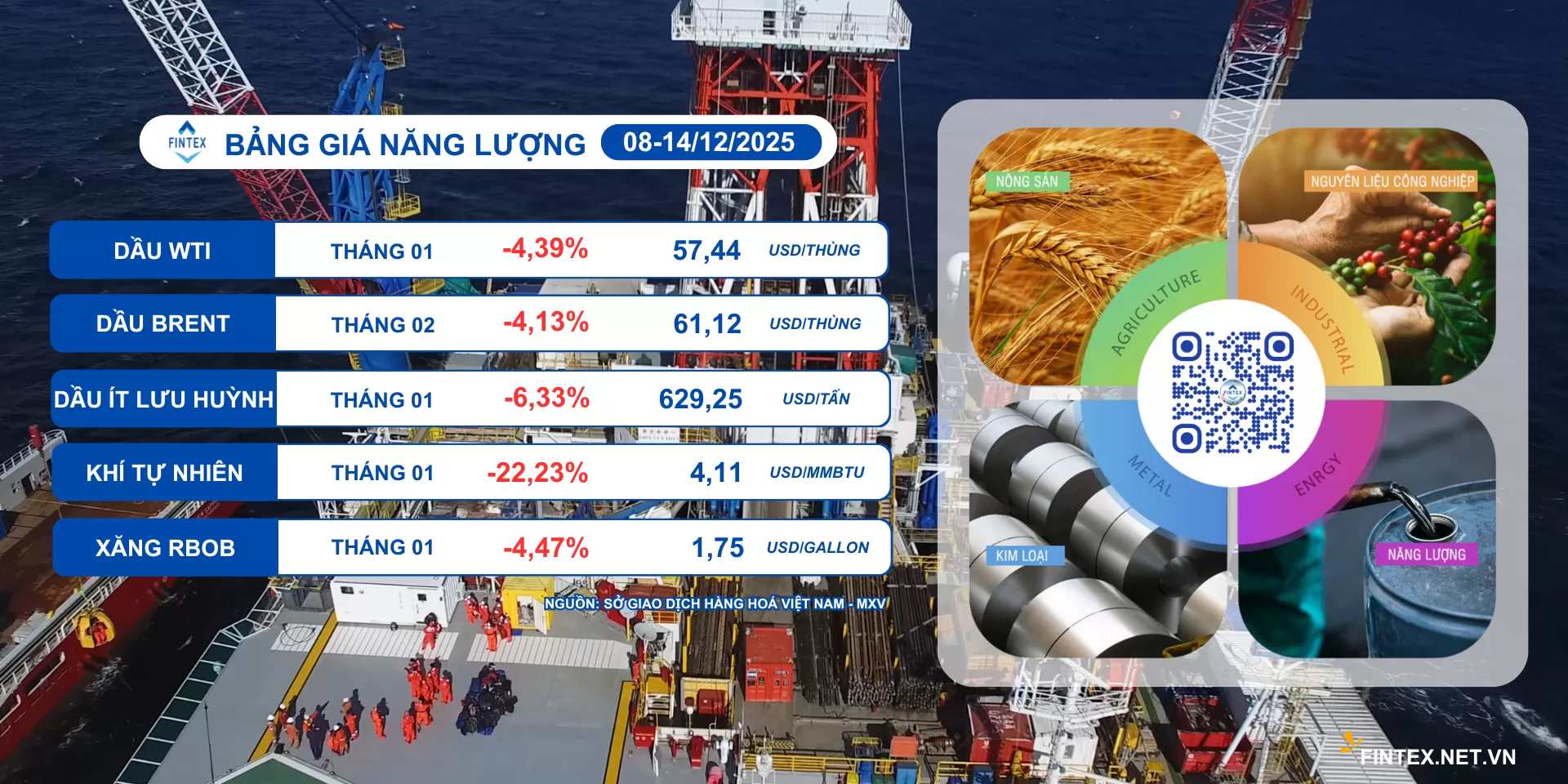 Theo ghi nhận từ Sở Giao dịch Hàng hoá Việt Nam (MXV), thị trường năng lượng tuần vừa qua chìm sâu trong sắc đỏ khi cả 5 mặt hàng trong nhóm đồng loạt lao dốc. Trong đó, giá dầu WTI đánh mất tới gần 4,4% so với tuần trước đó về mức 57,4 USD/thùng; giá dầu Brent cũng lùi về mốc 61,1 USD/thùng, giảm hơn 4,1%.