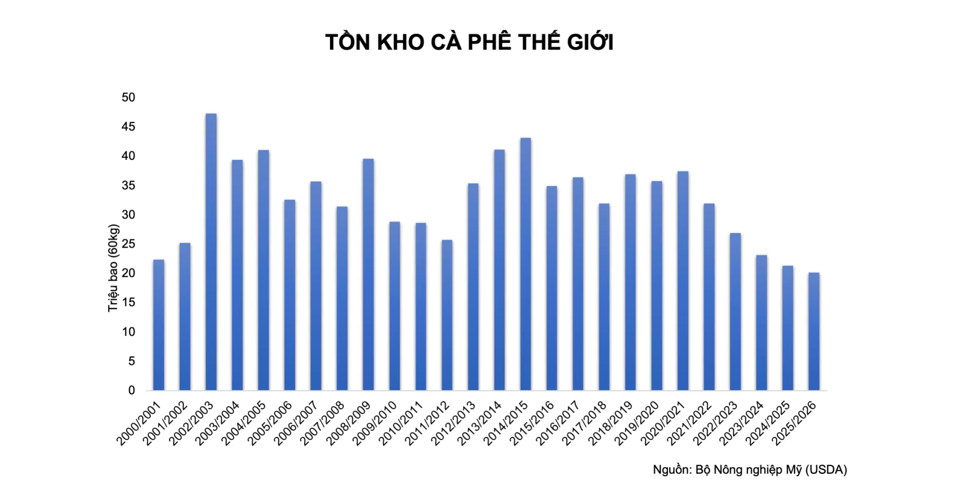 Theo MXV, yếu tố cốt lõi hỗ trợ giá cà phê hiện nay là mức tồn kho toàn cầu suy giảm mạnh. Bộ Nông nghiệp Mỹ (USDA) cho biết, tồn kho cà phê thế giới niên vụ 2025-2026 đã xuống mức thấp nhất trong vòng 25 năm. Lượng Arabica lưu kho tại sàn ICE Mỹ giảm 35,7% so với cùng kỳ năm ngoái, trong khi tồn kho Robusta cũng chạm mức thấp nhất trong 16 tháng.