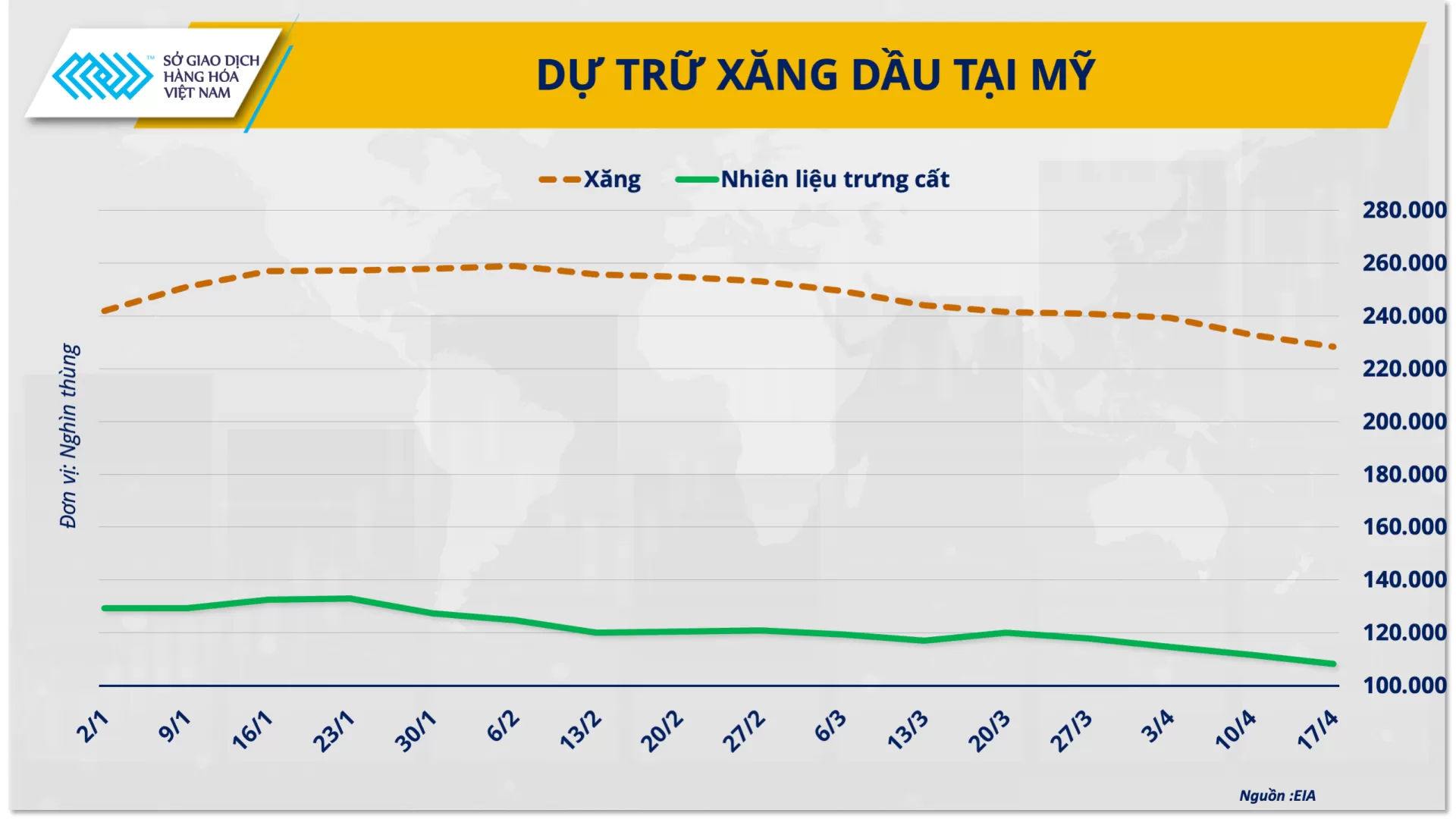 Bên cạnh yếu tố địa chính trị, dữ liệu từ Cơ quan Thông tin Năng lượng Mỹ (EIA) cũng góp phần củng cố đà tăng. Theo dữ liệu của EIA, trong tuần kết thúc ngày 17/4, tồn kho xăng của Mỹ giảm tuần thứ 10 liên tiếp xuống 4,57 triệu thùng; tồn kho nhiên liệu chưng cất giảm tuần thứ 4 liên tiếp, còn gần 3,43 triệu thùng - mức giảm sâu nhất kể từ đầu tháng 3.