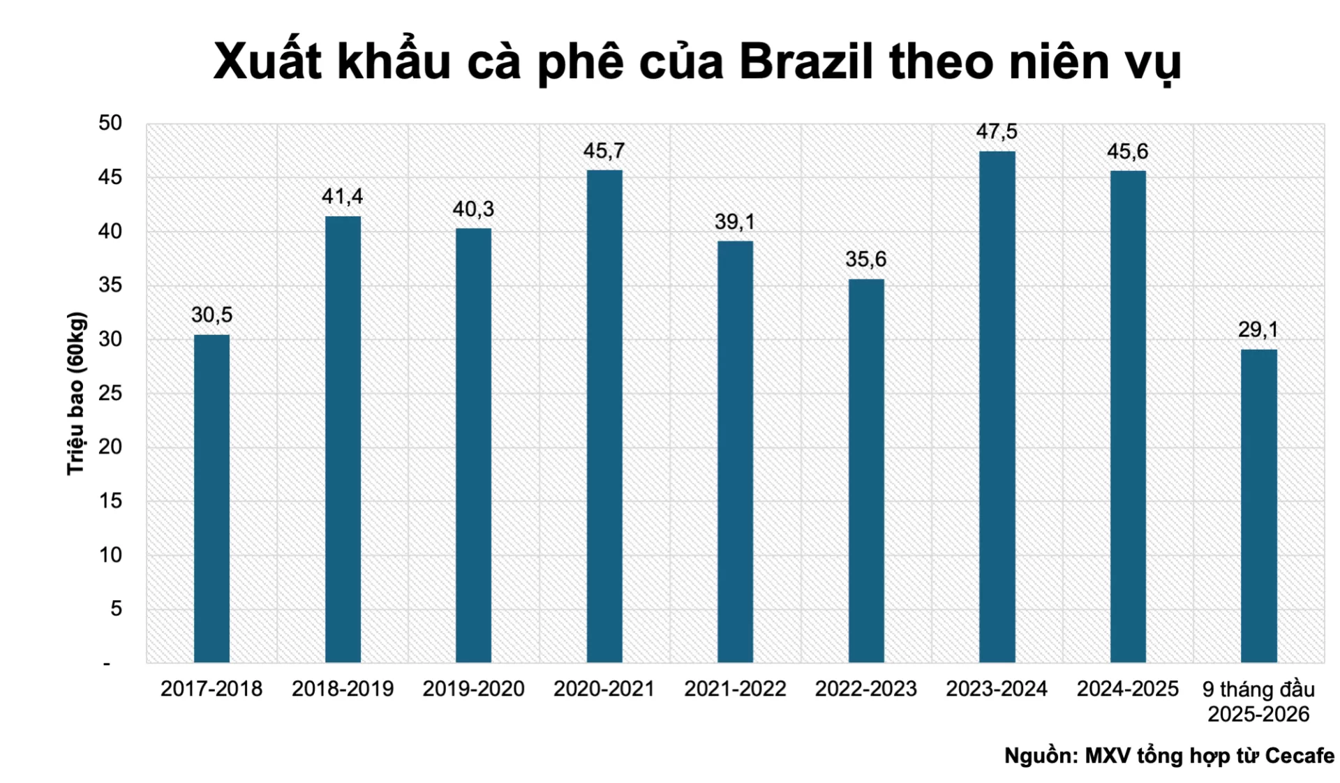 Dữ liệu thực tế đang củng cố nhận định này. Theo Cecafé, trong 9 tháng đầu niên vụ (từ tháng 7/2025 đến tháng 3/2026), Brazil chỉ xuất khẩu 29,09 triệu bao, giảm 21,2% so với cùng kỳ và là mức thấp nhất ghi nhận kể từ niên vụ 2022 - 2023.