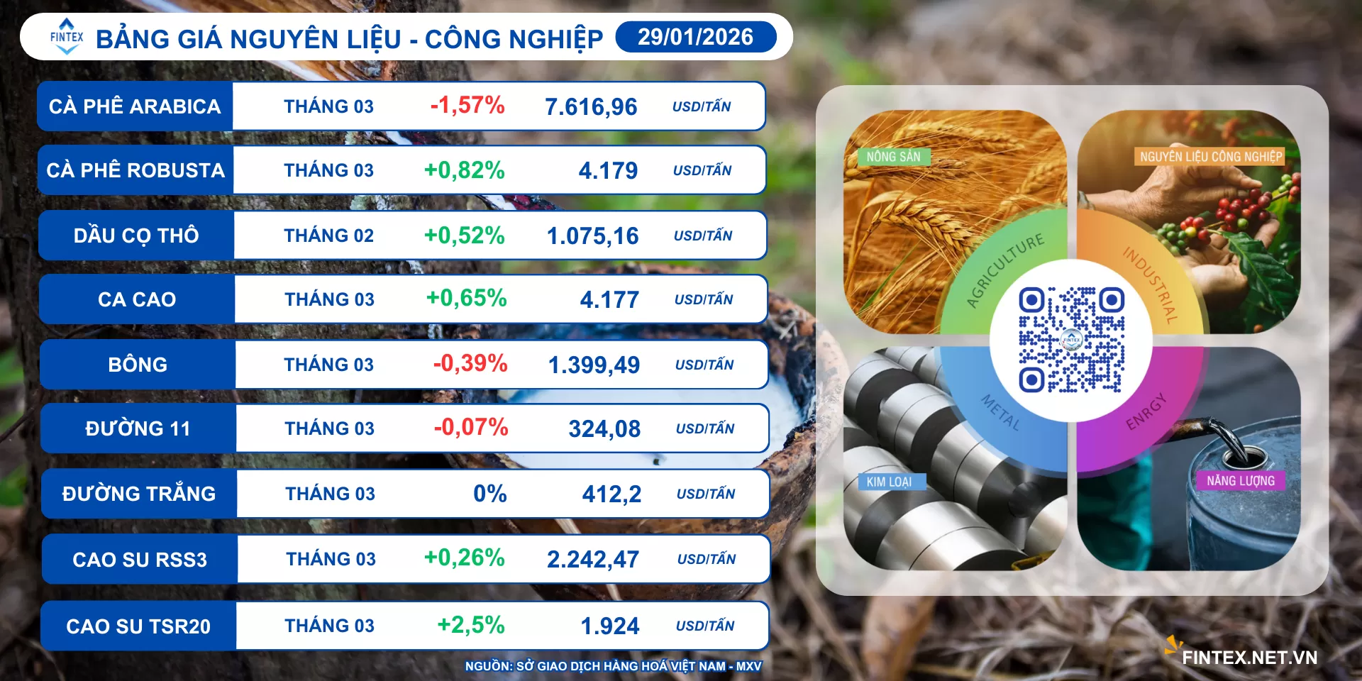 Trong khi đó, thị trường nguyên liệu công nghiệp cũng thu hút sự quan tâm của giới đầu tư khi giá hai mặt hàng cao su tiếp tục ghi nhận những tín hiệu khởi sắc. Trong đó, giá cao su TSR tiếp tục mở rộng đà tăng sang phiên thứ 3 liên tiếp, đạt mức 1.924 USD/tấn; giá cao su RSS3 cũng tăng gần 0,3%, dừng ở mốc 2.240 USD/tấn.