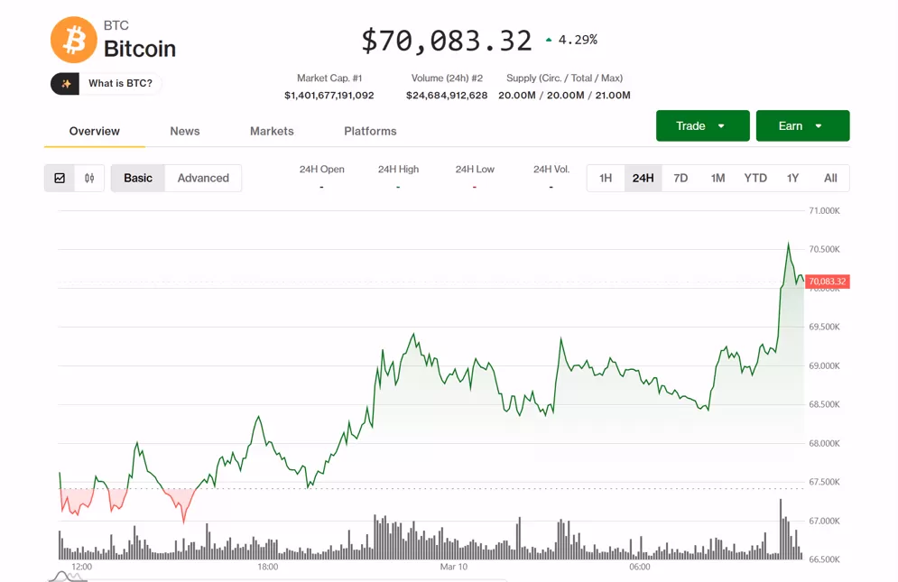 Sáng thứ Ba theo giờ Đông Á, Bitcoin đã vượt mốc 70.000 đô la , hoàn thành quá trình phục hồi nhanh chóng sau đợt bán tháo cuối tuần khiến tài sản kỹ thuật số lớn nhất này giảm xuống khoảng 65.000 đô la.