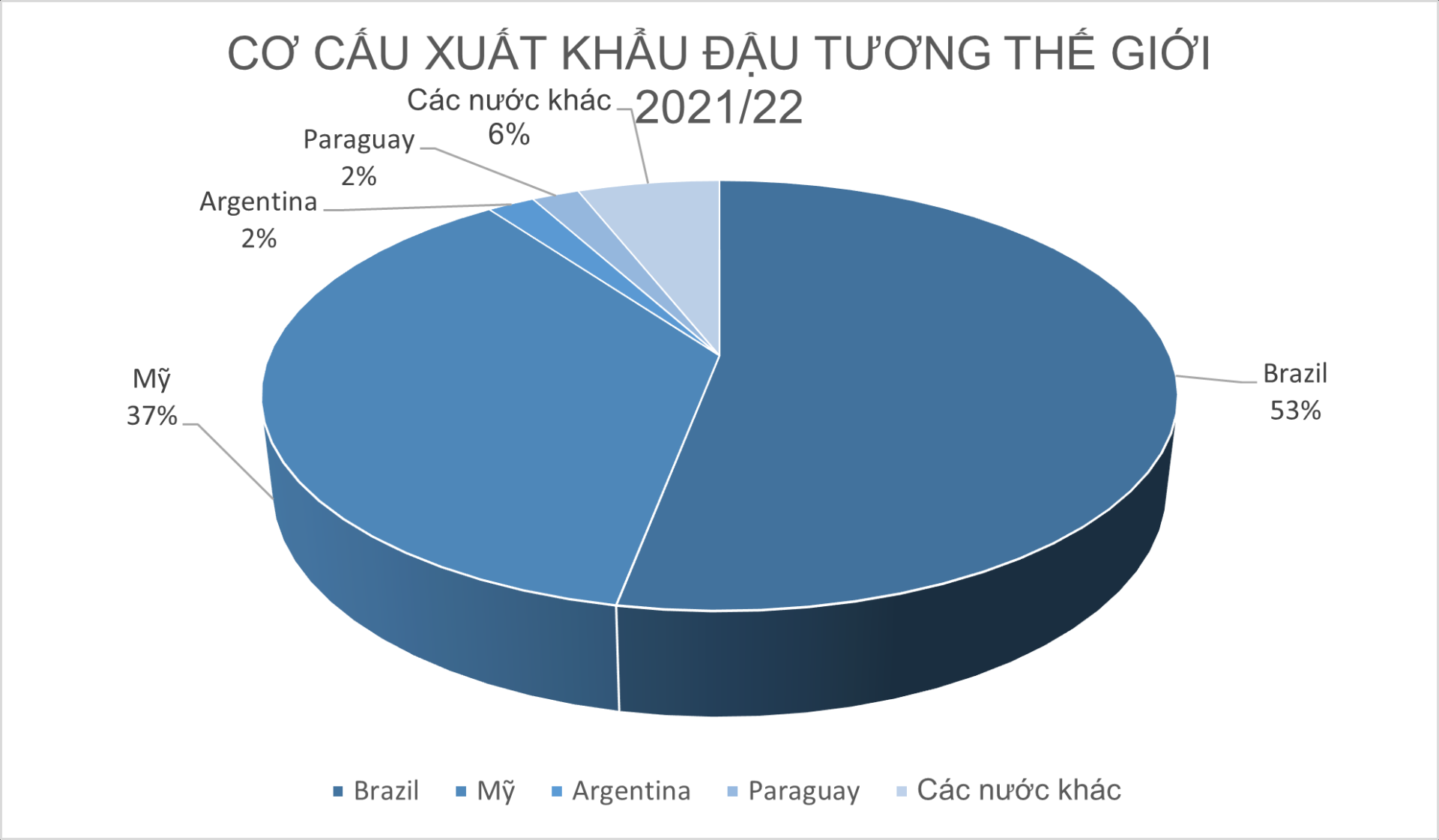 Những nước xuất khẩu Đậu tương nhiều trên thế giới chủ yếu là Mỹ và Brazil, mỗi nước xuất khẩu đến hơn nửa sản lượng Đậu tương thu hoạch mỗi năm- Brazil là nước xuất khẩu Đậu tương lớn nhất thế giới chiếm 53% và Mỹ chiếm 37%. USDA dự báo xuất khẩu Đậu tương toàn cầu niên vụ 2020/2021 đạt 167,82 triệu tấn