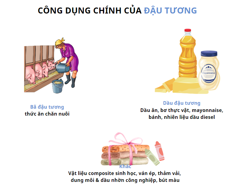 Sản phẩm phụ từ đậu tương còn được sử dụng nhiều làm thức ăn chăn nuôi nên nhu cầu đậu tương trên thế giới khá cao.