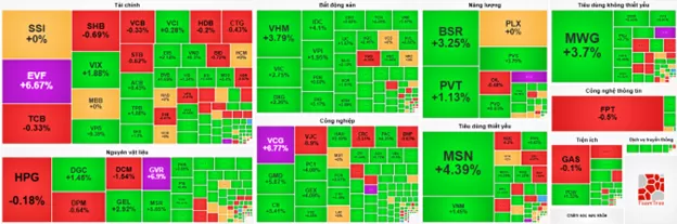 Ngoài ra, nhóm ngành tài chính diễn biến phân hóa mạnh và ghi nhận mức sụt giảm nhẹ. Các mã cổ phiếu giảm như TCB giảm 0.33%, VCB giảm 0.17%, SHB giảm 0.34%, MBB giảm 0.19%... riêng ở chiều mua vẫn có EVF tăng kịch trần, VIX tăng 1.88%, VPB tăng 0.78%, VCI tăng 0.42%...