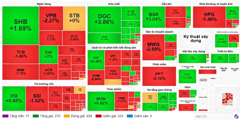 Trong đó, sự đi xuống của các cổ phiếu ngân hàng là một trong những tác nhân kéo lùi điểm số thị trường. Hàng loạt cổ phiếu “vua” đang giảm 2-3%, kể đến TCB, CTG, TPB, VIB, LPB… thậm chí giảm mạnh hơn. Đây là ngành vốn dĩ được nhiều nhà đầu tư, từ cá nhân đến tổ chức, chọn mặt gửi vàng. Ngoài ra, nhiều cổ phiếu đáng chú ý như FPT giảm 3.12%, HPG giảm 2.19%, MWG giảm 3.35%, VNM giảm 1.9%... cũng khiến danh mục của nhiều nhà đầu tư gặp áp lực.