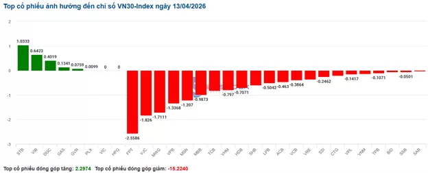 Độ rộng rổ VN30 vẫn chưa có sự cải thiện đáng kể khi số lượng mã giảm có phần áp đảo hơn. Cụ thể, FPT, VJC, MWG và VPB lần lượt lấy đi 2.55 điểm, 1.82 điểm, 1.71 điểm và 1.33 điểm từ chỉ số chung. Trái lại, chỉ còn một số ít các mã như STB, VIB, DGC, GAS, GVR và PLX giữ được sắc xanh và giúp VN30-Index níu giữ được gần 2.3 điểm.