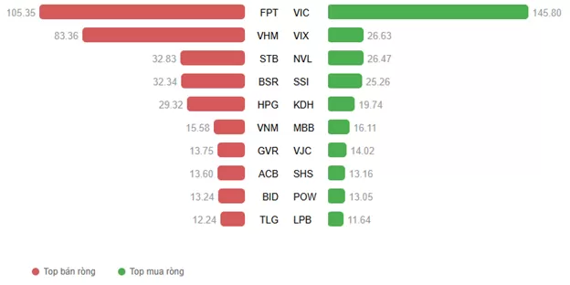Khối ngoại bán ròng với giá trị 48.36 tỷ đồng trên cả ba sàn. Lực bán chủ yếu tập trung ở FPT và VHM với giá trị lần lượt là 105.35 tỷ và 83.36 tỷ. Trong khi đó, dẫn đầu top mua ròng là VIC với giá trị 145.8 tỷ đồng, bỏ xa các cổ phiếu còn lại.