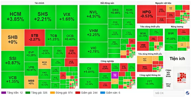 Nhóm cổ phiếu bất động sản tiếp tục dẫn dắt thị trường chung với đà tăng 1.76%. Cụ thể, NVL tăng 6.43%, VHM tăng 1.32%, VIC tăng 2.48% và VRE tăng 1.79%...
