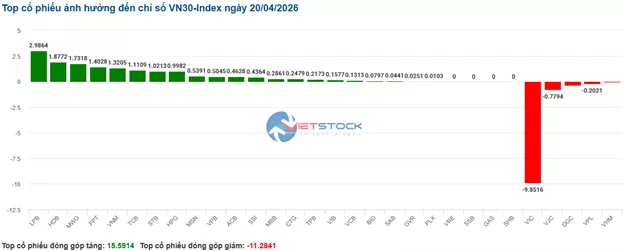 Các mã cổ phiếu trong rổ VN30 với sắc xanh có phần áp đảo hơn. Cụ thể, LPB, HDB, MWG và FPT lần lượt đóng góp 2.98 điểm, 1.87 điểm, 1.73 điểm và 1.4 điểm vào chỉ số chung. Trái lại, VIC, VJC, DGC, VPL và VHM là 5 mã vẫn chịu áp lực bán và lấy đi hơn 11.2 điểm từ VN30-Index.