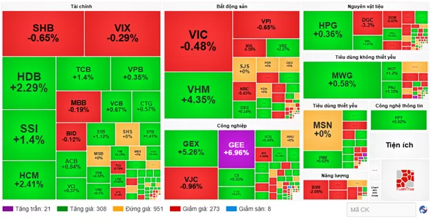 Tuy sắc xanh vẫn hiện diện ở phần lớn các nhóm ngành nhưng áp lực bán mạnh ở nhóm bất động sản vẫn gấy sức ép lên chỉ số chung với sắc đỏ tập trung ở VIC giảm 3.14%, KSF giảm 7.43%, KBC giảm 0.14%. Trong khi, chiều mua vẫn duy trì ở phần lớn các mã còn lại như VHM tăng 1.99%, NVL tăng 0.29%, CEO tăng 0.58%, DXG tăng 1.34%…