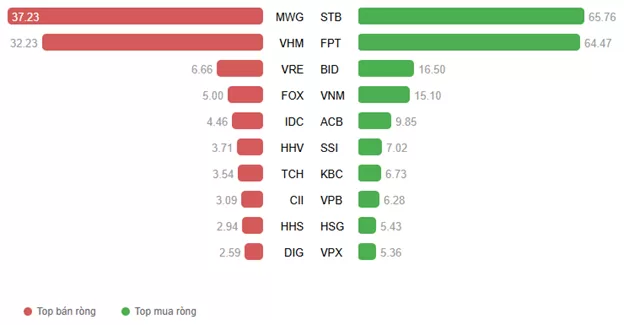 Khối ngoại mua ròng với giá trị 129.61 tỷ đồng trên cả ba sàn. Lực mua chủ yếu tập trung ở STB và FPT với giá trị lần lượt là 65.76 tỷ và 64.47 tỷ. Trong khi đó, dẫn đầu top bán ròng là MWG với giá trị là 37.23 tỷ đồng.