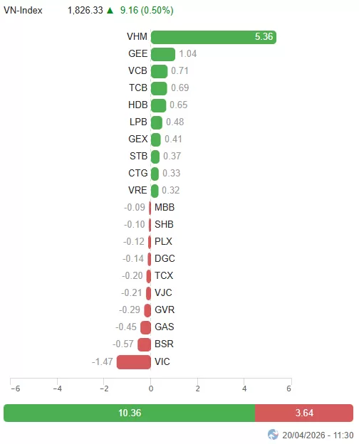 | Top 10 cổ phiếu tác động mạnh tới VN-Index phiên 20/04/2026 (tính theo điểm) | ||
