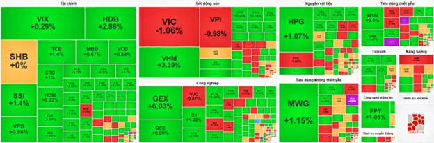 Kết phiên, thị trường tăng với sắc xanh đỏ đan xen ở các nhóm ngành. Trong đó, ngành bất động sản là nhóm có mức tăng mạnh nhất thị trường với 2.26% chủ yếu đến từ các cổ phiếu như VIC (+1.65%), VHM (+6.93%), NVL (+0.59%), VRE (+2.97%), SJS (+0.57%) và BCM (+2.87%). Theo sau đó là ngành tiêu dùng không thiết yếu và công nghệ thông tin với mức tăng lần lượt là 1.43% và 1.08%. Trong hai nhóm ngành đó, một số mã ghi nhận tăng mạnh tiêu biểu như VPL (+3.02%), MWG (+0.46%), PNJ (+3.6%), DGW (+0.11%), PPH (+0.36%), FPT(+1.18%), CMG (+0.7%), DLG (+0.36%) và HPT (+1.5%).