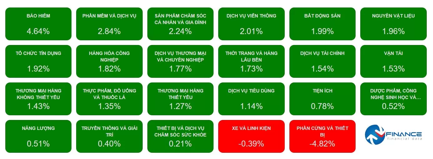 Sắc xanh đang chiếm ưu thế ở hầu hết các nhóm ngành. Duy chỉ có nhóm xe và linh kiện, phần cứng và thiết bị là giảm điểm. Trong đó, mức giảm mạnh 11% của cổ phiếu VEC đã kéo điểm số chung của cả nhóm phần cứng và thiết bị đi xuống. Ở nhóm này, DLG, SMT vẫn đang duy trì sắc xanh tích cực.