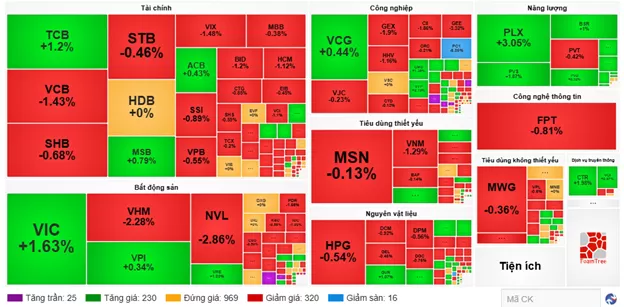 So với đầu phiên, bên bán đã có phần áp đảo hơn. Số mã giảm là 336 mã (16 mã giảm sàn) và số mã tăng là 255 mã (25 mã tăng trần).