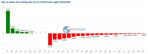 Sự điều chỉnh của VCB, VIC và VHM đang gây nhiều sức ép khi lấy đi khoảng 4 điểm của VN-Index và tiếp tục biến động khó lường. Ngược lại, GAS, BSR và GVR tác động tích cực với đóng góp khoảng 2.5 điểm.