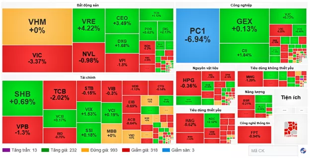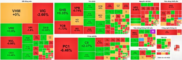 Sắc đỏ bao trùm lên hầu hết các nhóm ngành, trong đó bất động sản tạm thời “đội sổ” với mức giảm 1.87%, chịu tác động từ đà điều chỉnh của nhiều cổ phiếu như VIC (-3.37%), BCM (-0.75%), NVL (-0.98%), VPI (-1.8%) và IDC (-2.19%).