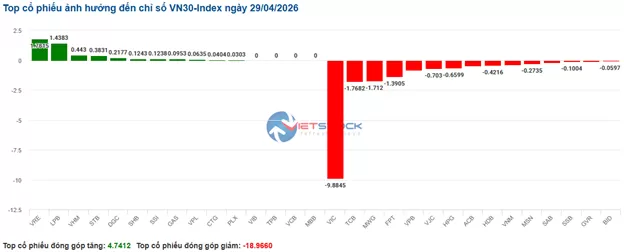 | Top 10 cổ phiếu tác động mạnh tới VN-Index phiên sáng 29/04/2026 (tính theo điểm) | ||