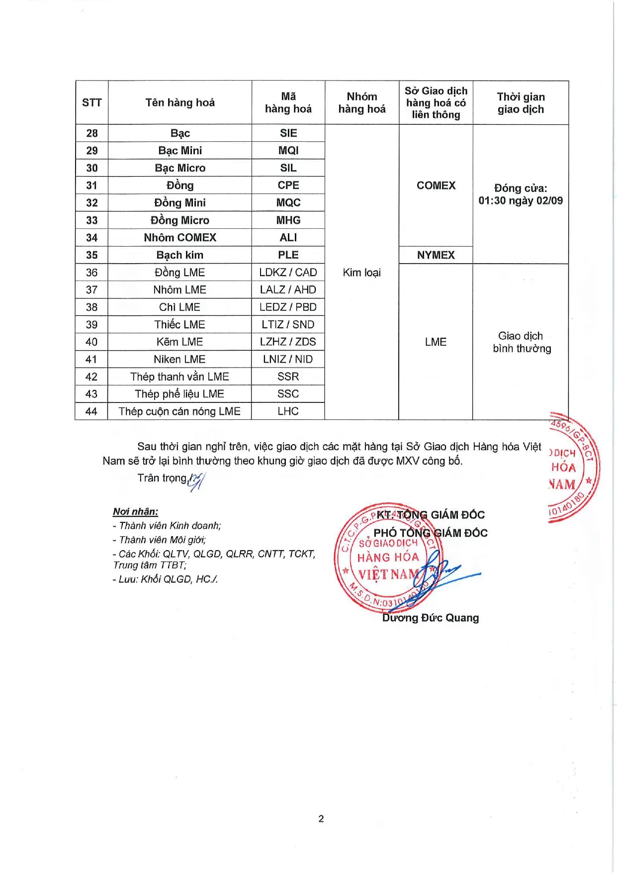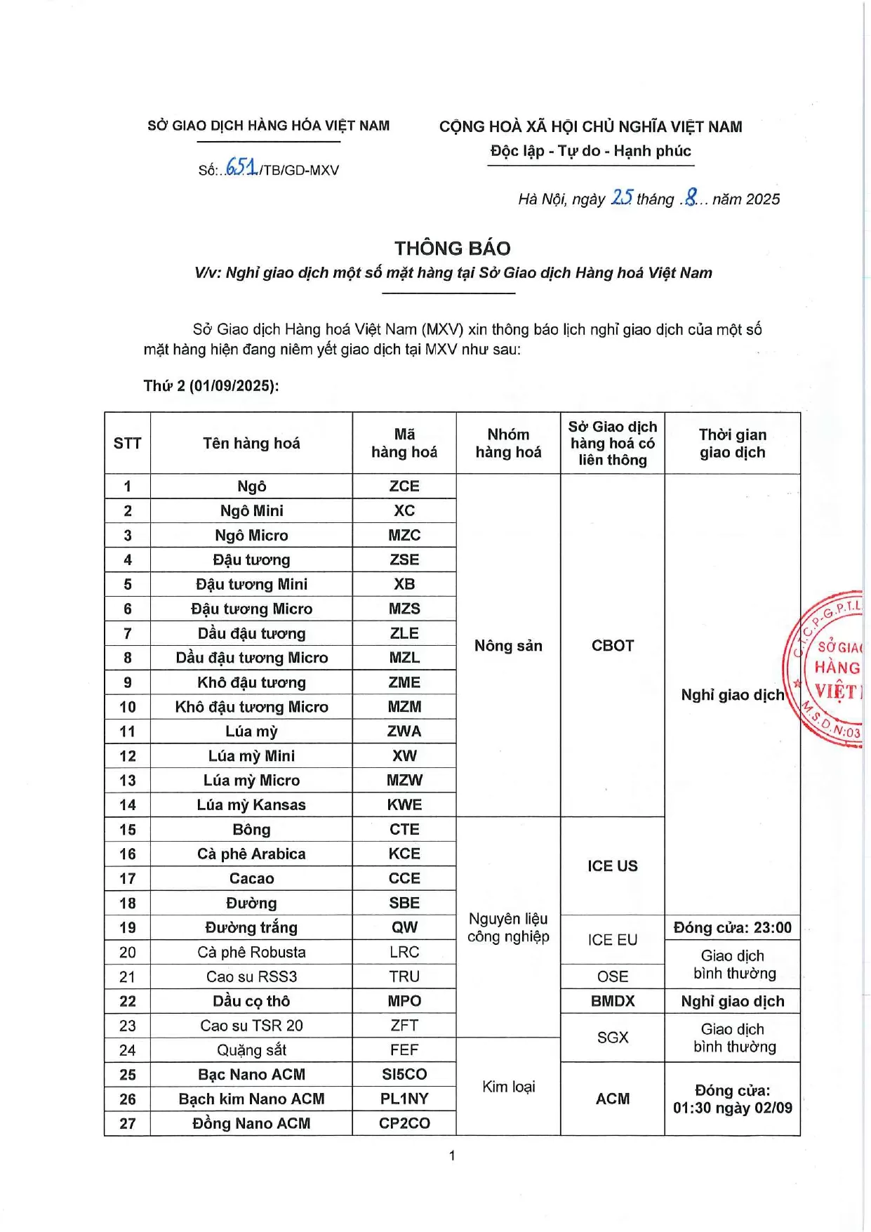 Theo quyết định của Sở Giao dịch hàng hóa Việt Nam (MXV), Công ty Nhat Linh Investment., JSC gửi đến Quý Khách hàng Thông báo số 651/TB/TGĐ-MXV ngày 25/08/2025. V/v Lịch Nghỉ giao dịch một số mặt hàng tại Sở Giao dịch Hàng hóa Việt Nam (MXV).