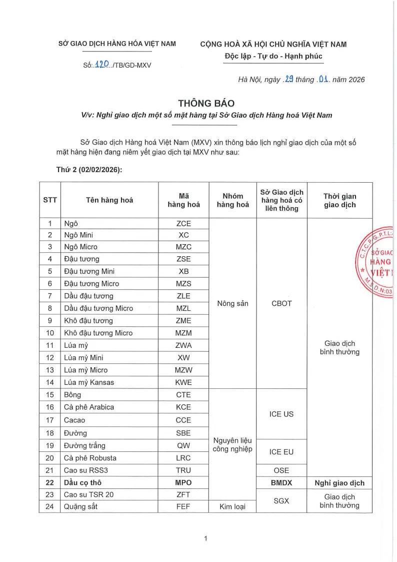 Theo quyết định của Sở Giao dịch hàng hóa Việt Nam (MXV), Công ty Fintex Investment., JSC gửi đến Quý Khách hàng Thông báo số 120/TB/TGĐ-MXV ngày 29/01/2026. V/v Lịch Nghỉ giao dịch một số mặt hàng tại Sở Giao dịch Hàng hóa Việt Nam (MXV).