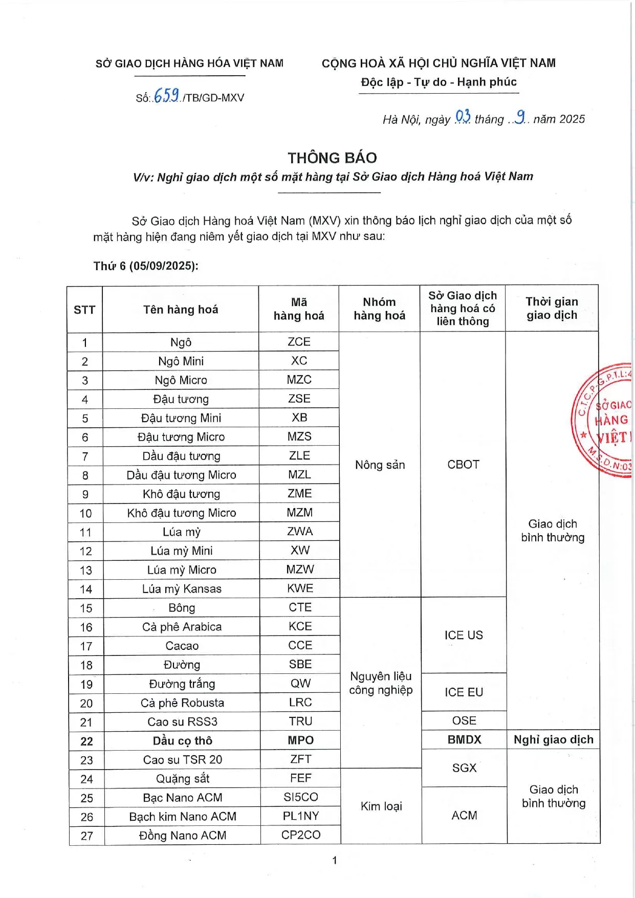 Theo quyết định của Sở Giao dịch hàng hóa Việt Nam (MXV), Công ty Nhat Linh Investment., JSC gửi đến Quý Khách hàng Thông báo số 659/TB/TGĐ-MXV ngày 03/09/2025. V/v Lịch Nghỉ giao dịch một số mặt hàng tại Sở Giao dịch Hàng hóa Việt Nam (MXV).
