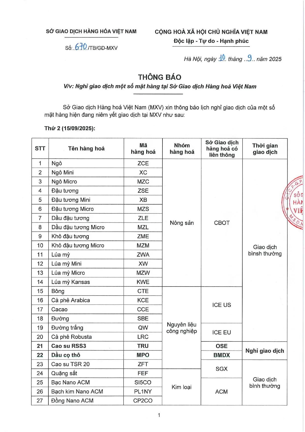 Theo quyết định của Sở Giao dịch hàng hóa Việt Nam (MXV), Công ty Nhat Linh Investment., JSC gửi đến Quý Khách hàng Thông báo số 670/TB/TGĐ-MXV ngày 10/09/2025. V/v Lịch Nghỉ giao dịch một số mặt hàng tại Sở Giao dịch Hàng hóa Việt Nam (MXV).
