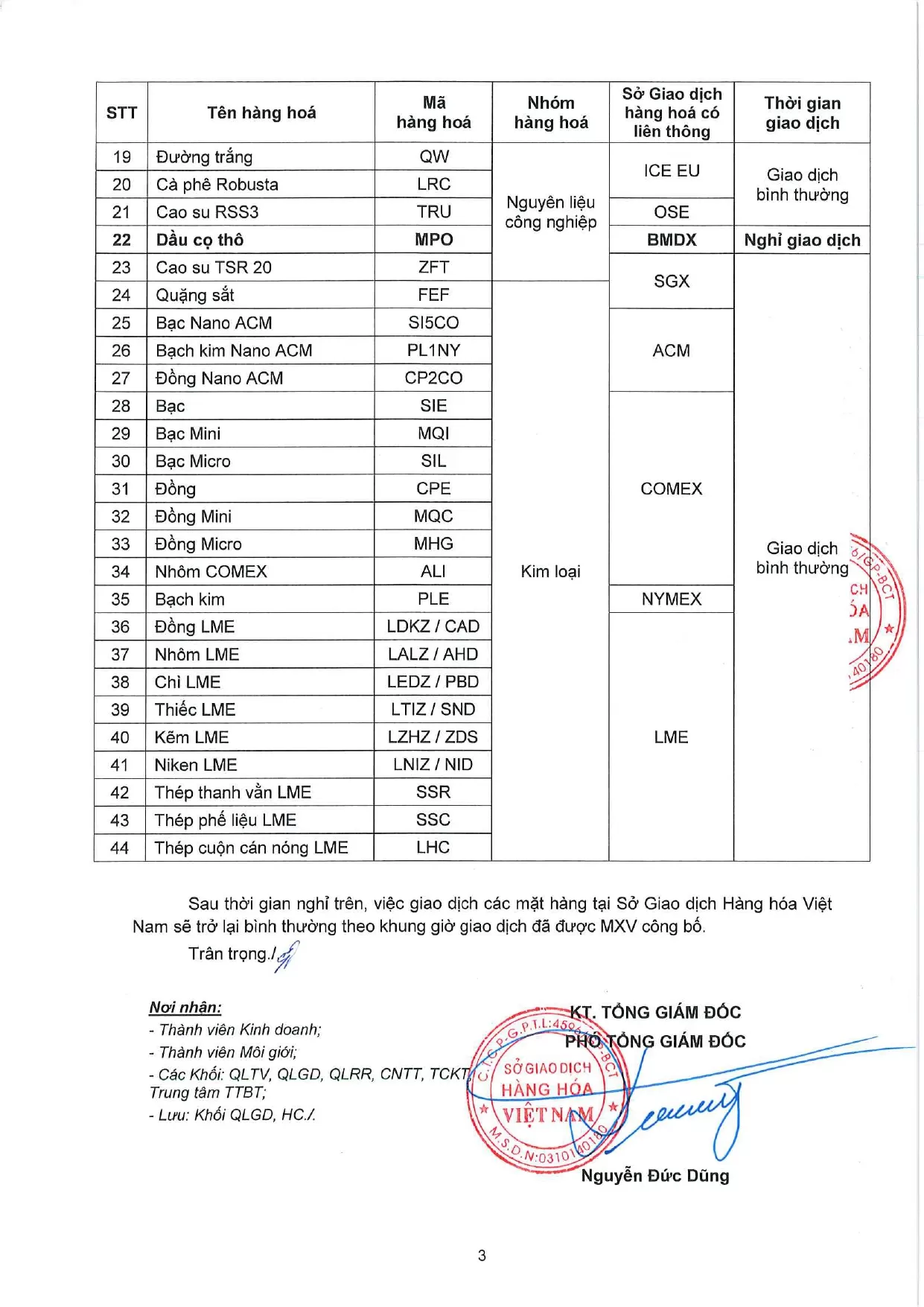 Sau thời gian nghỉ trên, việc giao dịch các mặt hàng tại Sở Giao dịch Hàng hóa Việt Nam (MXV) sẽ trở lại bình thường theo khung giờ đã được MXV công bố.