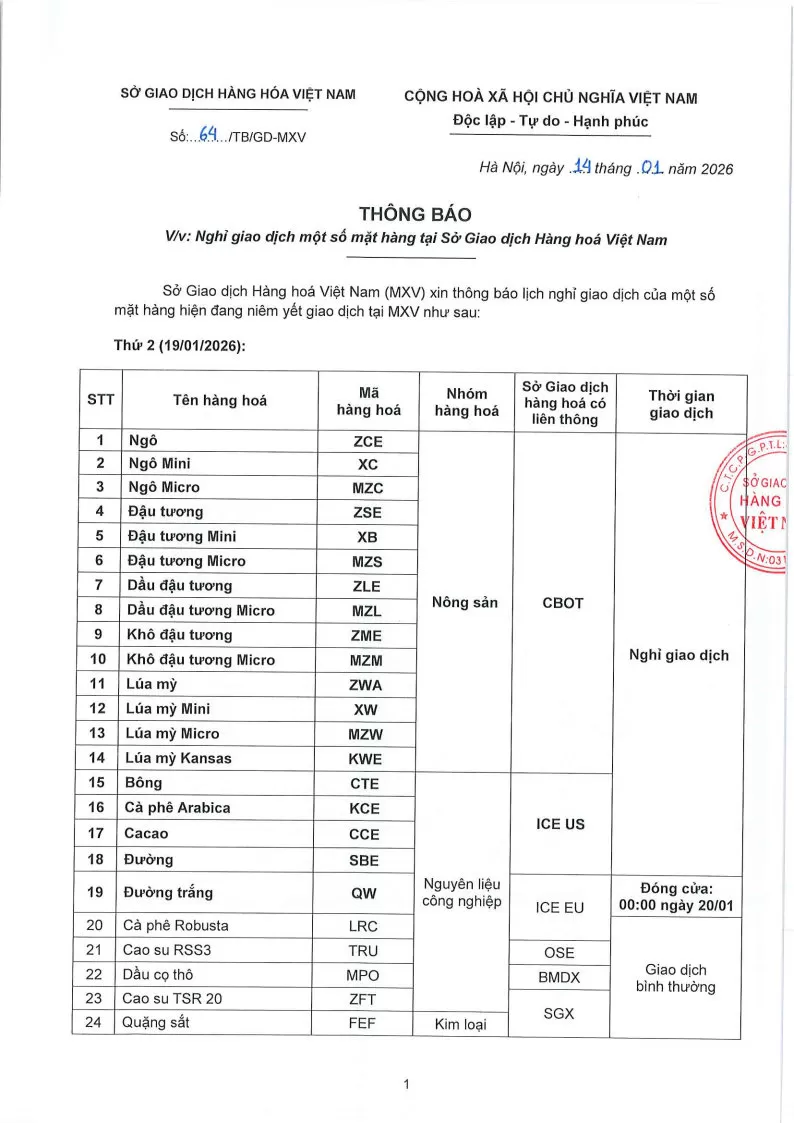 Theo quyết định của Sở Giao dịch hàng hóa Việt Nam (MXV), Công ty Fintex Investment., JSC gửi đến Quý Khách hàng Thông báo số 64/TB/TGĐ-MXV ngày 14/01/2026. V/v Lịch Nghỉ giao dịch một số mặt hàng tại Sở Giao dịch Hàng hóa Việt Nam (MXV).