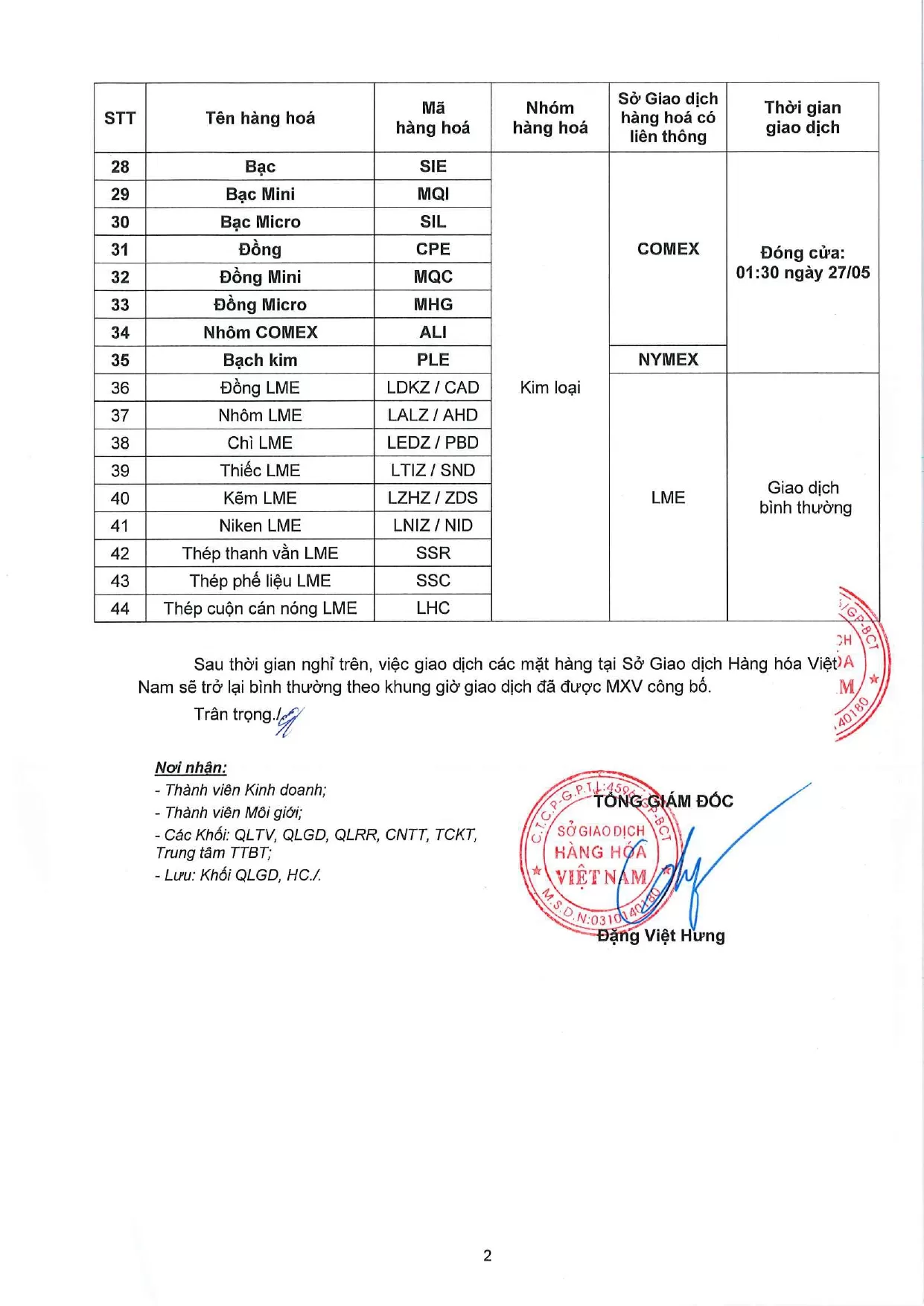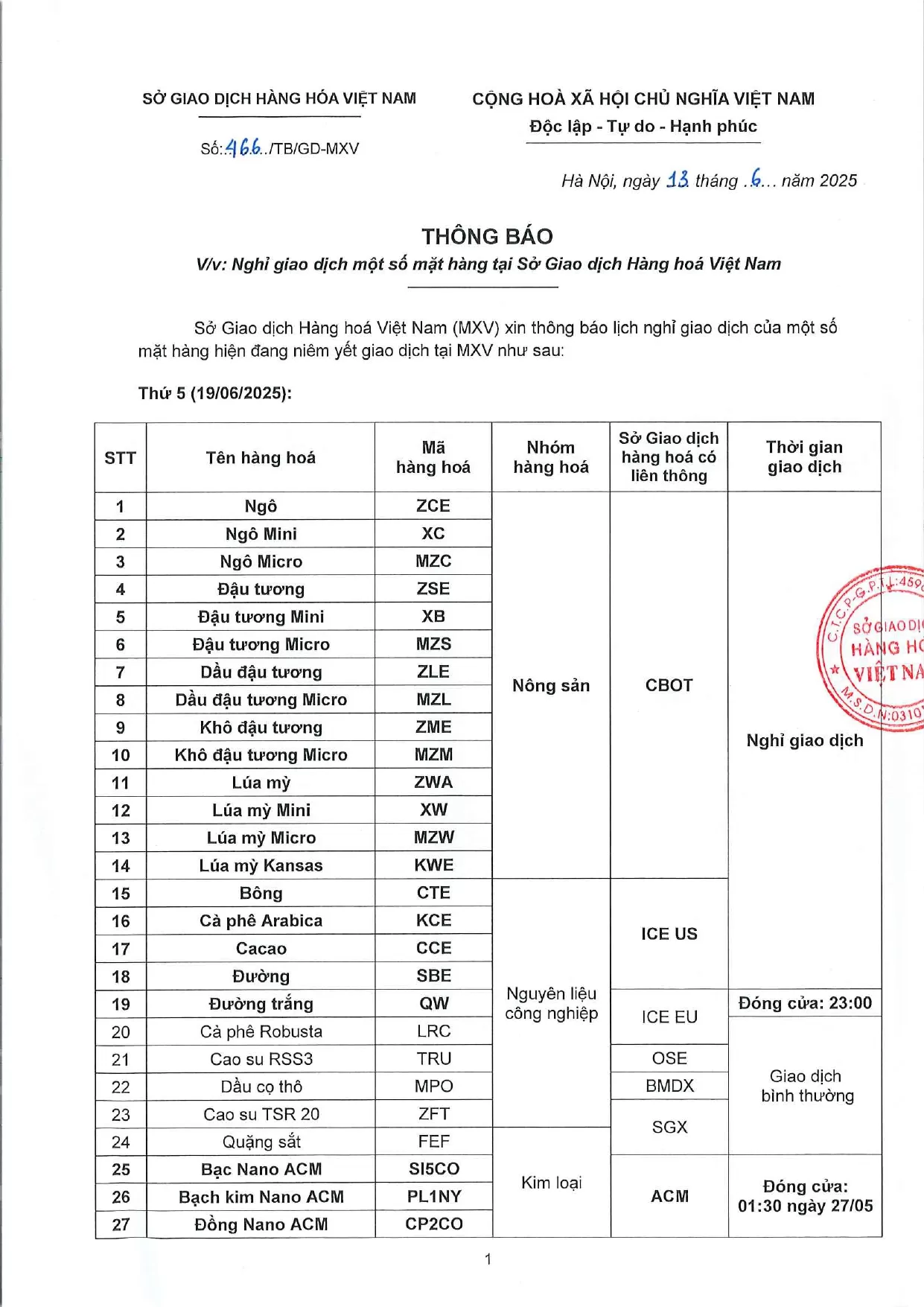 Theo quyết định của Sở Giao dịch hàng hóa Việt Nam (MXV), Công ty Nhat Linh Investment., JSC gửi đến Quý Khách hàng Thông báo số 466/TB/TGĐ-MXV ngày 13/06/2025. V/v Lịch Nghỉ giao dịch một số mặt hàng tại Sở Giao dịch Hàng hóa Việt Nam (MXV).