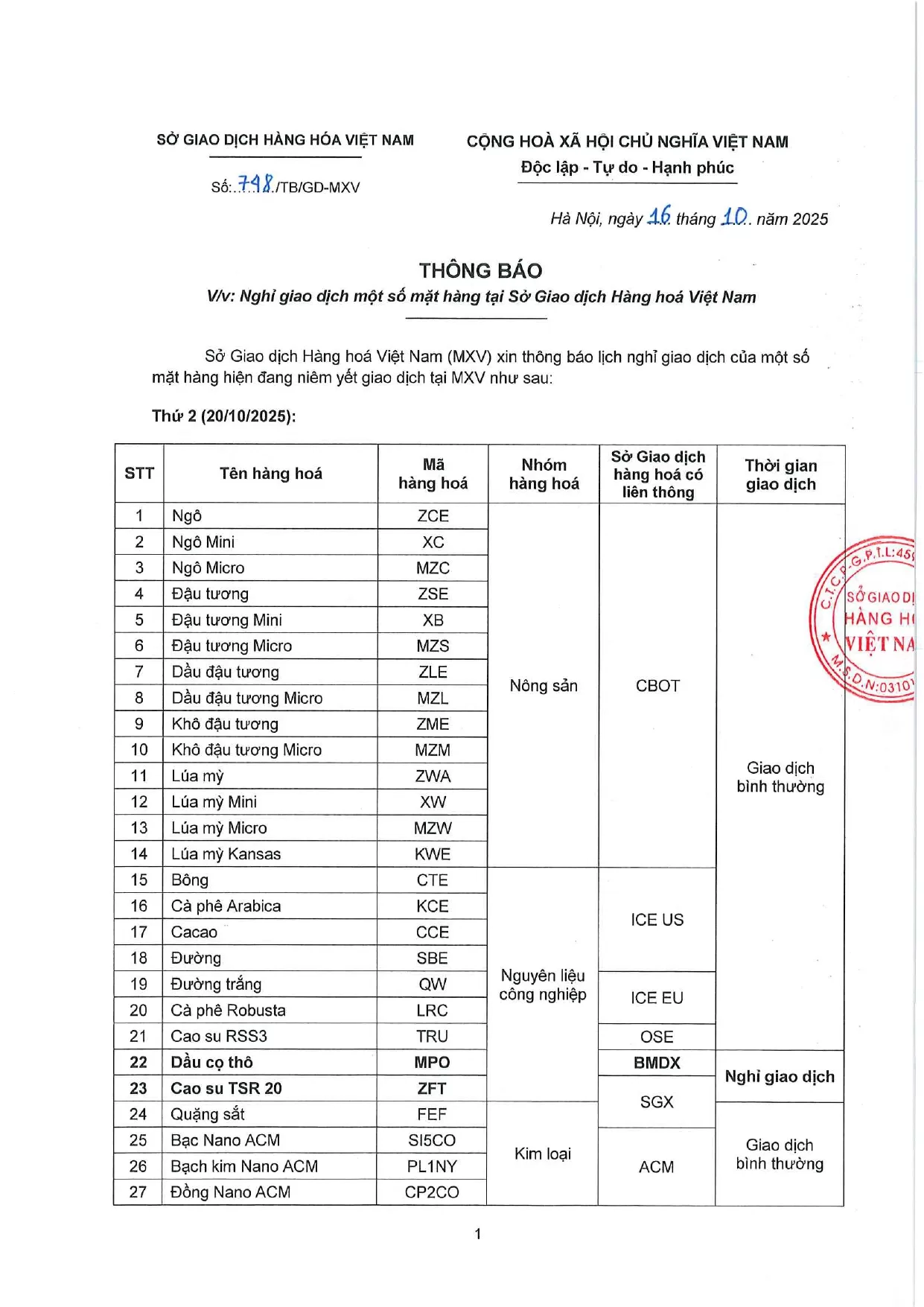 Theo quyết định của Sở Giao dịch hàng hóa Việt Nam (MXV), Công ty Nhat Linh Investment., JSC gửi đến Quý Khách hàng Thông báo số 748/TB/TGĐ-MXV ngày 16/10/2025. V/v Lịch Nghỉ giao dịch một số mặt hàng tại Sở Giao dịch Hàng hóa Việt Nam (MXV).