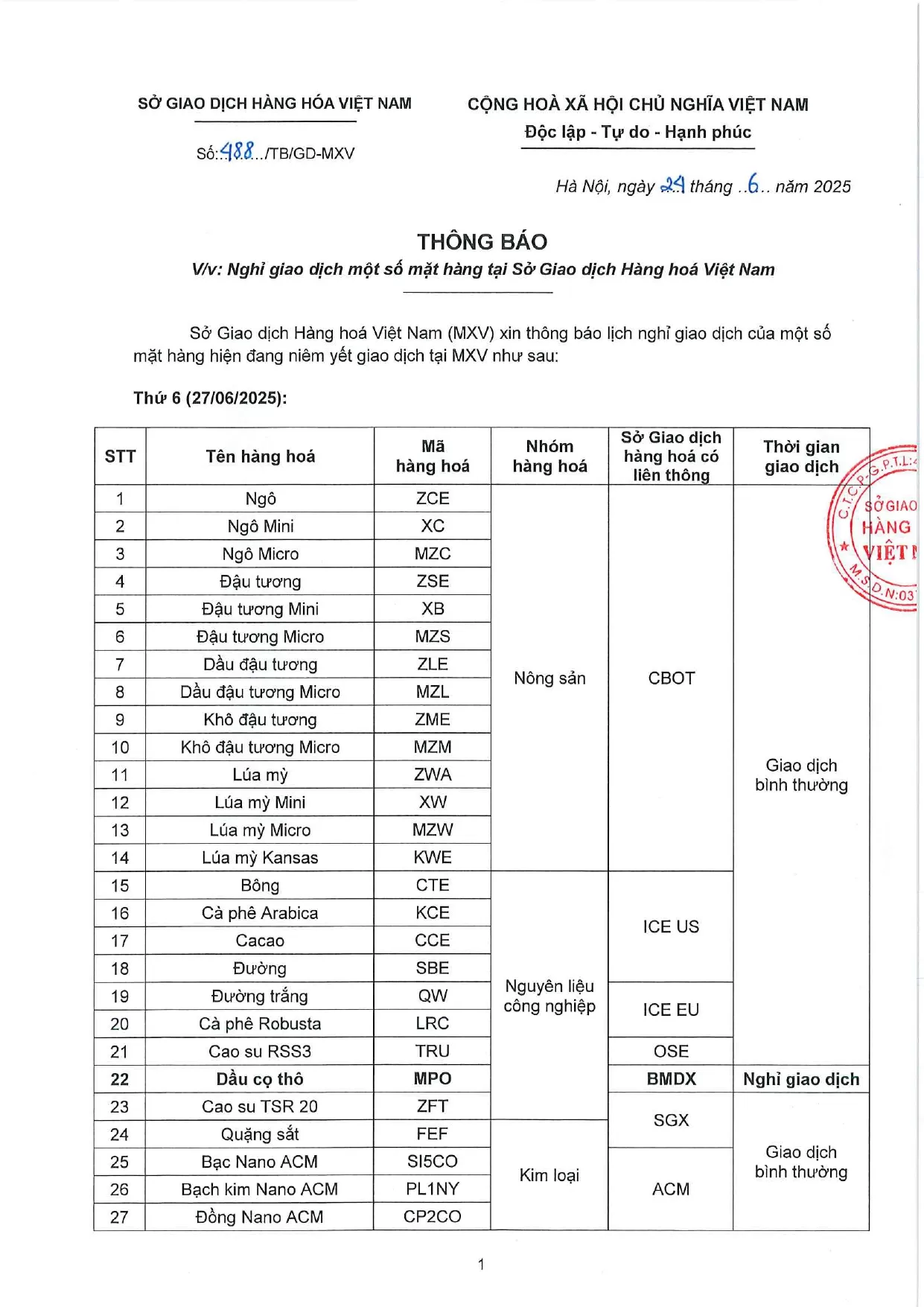 Theo quyết định của Sở Giao dịch hàng hóa Việt Nam (MXV), Công ty Nhat Linh Investment., JSC gửi đến Quý Khách hàng Thông báo số 488/TB/TGĐ-MXV ngày 24/06/2025. V/v Lịch Nghỉ giao dịch một số mặt hàng tại Sở Giao dịch Hàng hóa Việt Nam (MXV).