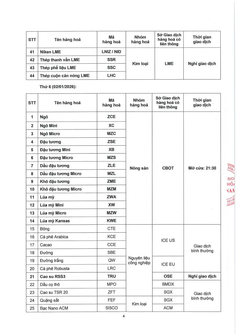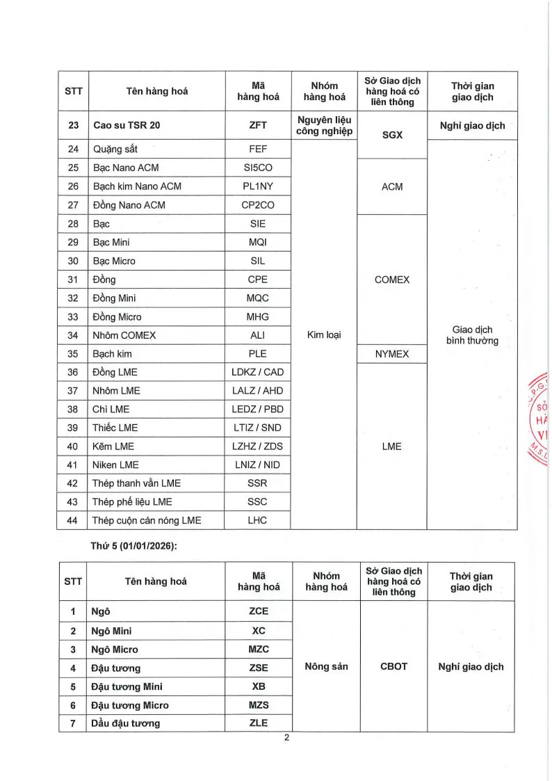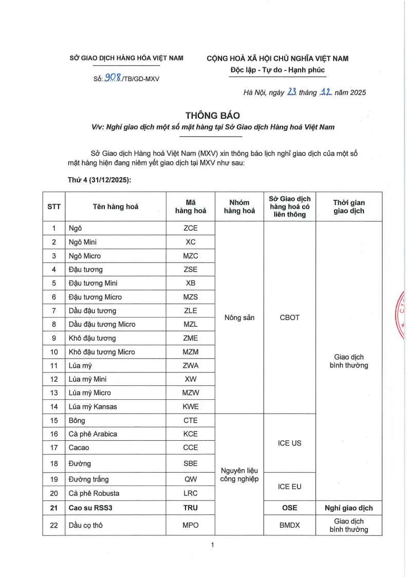 Theo quyết định của Sở Giao dịch hàng hóa Việt Nam (MXV), Công ty Fintex Investment., JSC gửi đến Quý Khách hàng Thông báo số 908/TB/TGĐ-MXV ngày 23/12/2025. V/v Lịch Nghỉ giao dịch một số mặt hàng tại Sở Giao dịch Hàng hóa Việt Nam (MXV).