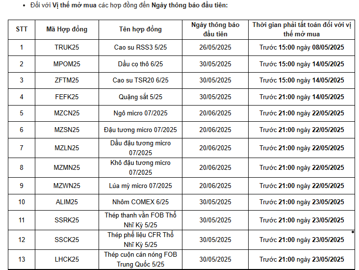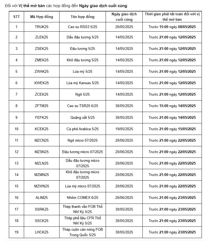 Căn cứ thông báo của Sở Giao dịch Hàng hóa Việt Nam (MXV), Công ty Nhat Linh Investment., JSC xin thông báo tới Quý Khách hàng thời hạn tất toán hợp đồng tháng 05/2025 Đợt 01 như sau: