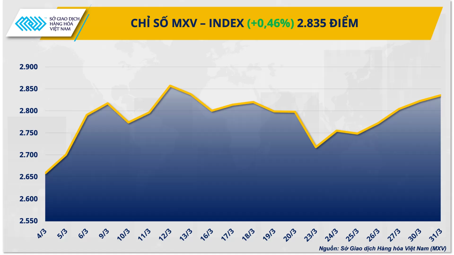 Tuy nhiên, do giá năng lượng giảm sâu, chỉ số MXV-Index khi kết phiên chỉ tăng gần 0,5% lên 2.835 điểm.