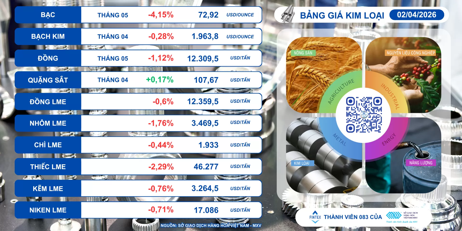 Bên cạnh đó, ngày 1/4, Sở Giao dịch Hàng hóa Việt Nam (MXV) đã điều chỉnh tăng mức ký quỹ ban đầu đối với một số sản phẩm bạc niêm yết trên sàn COMEX (Mỹ). Trong đó, hợp đồng bạc kỳ hạn tiêu chuẩn COMEX được nâng mức ký quỹ ban đầu từ 54.595 USD lên 57.511 USD.