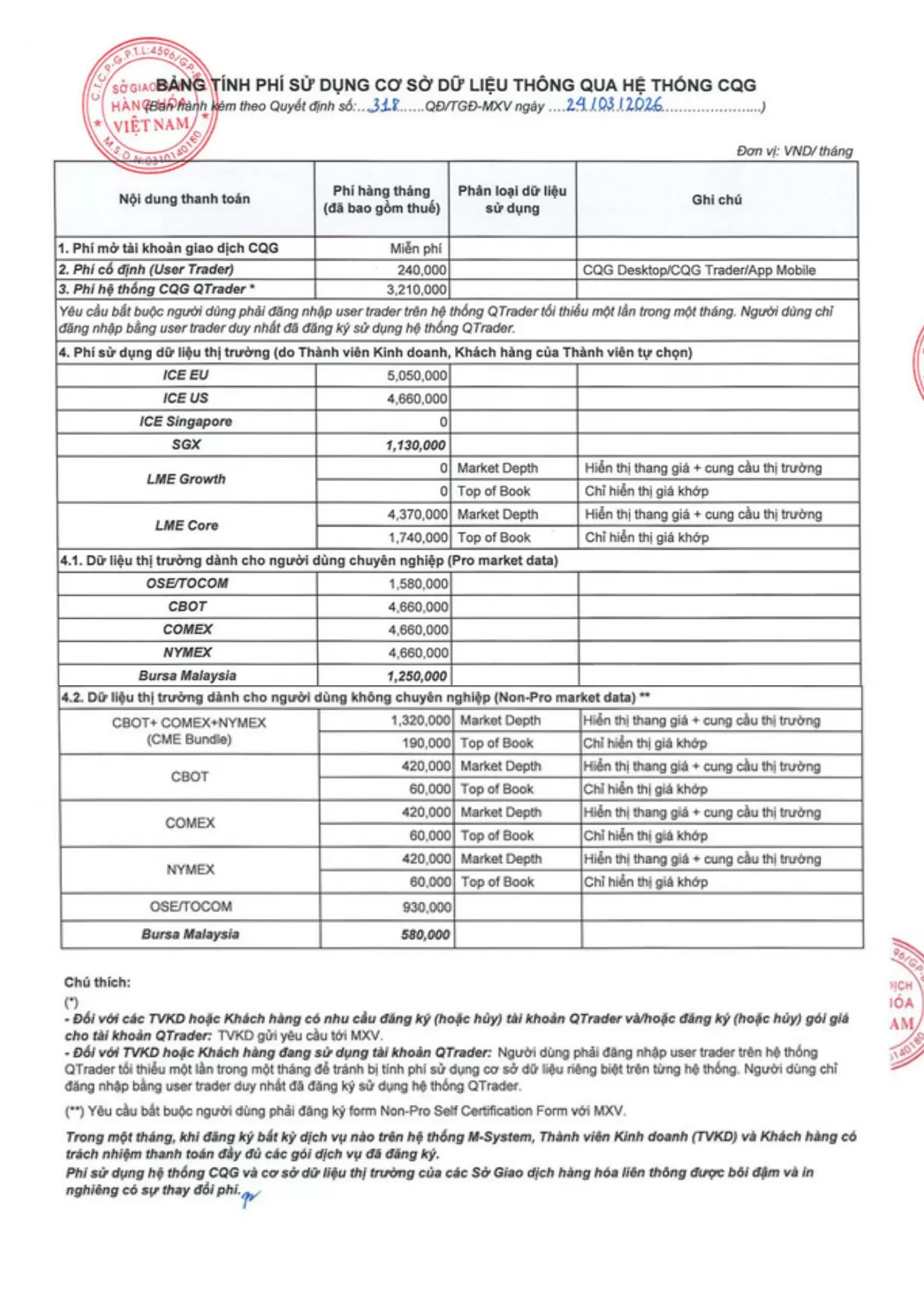 - Khách hàng đăng ký thêm các gói giá khác thì khách hàng sẽ tự trả phí theo bảng cước phí của Sở - MXV đã quy định.