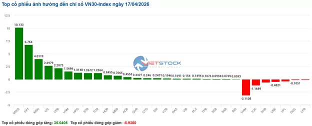 Top 10 cổ phiếu tác động mạnh tới VN-Index phiên sáng 17/04/2026 (tính theo điểm)