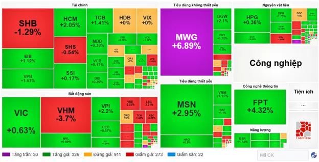 Phần lớn các mã cổ phiếu trong rổ VN30 đều mang sắc xanh, nổi bật có MWG góp 10.13 điểm, FPT góp 6.76 điểm, MSN góp gần 4.01 điểm và VIC góp 2.69 vào đà tăng của chỉ số. Trái lại, vẫn còn một số ít các mã chịu áp lực bán như VHM, VJC, SHB và VRE đã lấy đi hơn hơn 5.3 điểm.