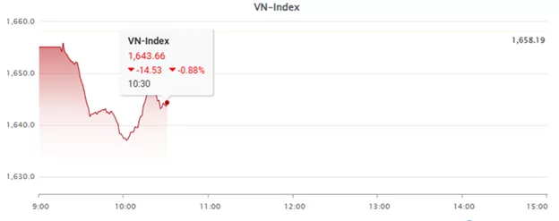 Sau khởi đầu bằng liên tiếp các nhịp giằng co, khoảng thời gian nửa cuối phiên sáng lại diễn ra hết sức bình lặng. Kết phiên sáng, VN-Index ghi nhận mức 1,640.38, tương ứng giảm 17.81 điểm.