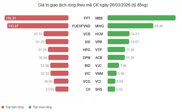 Giao dịch khối ngoại cũng thu hút nhiều sự quan tâm, khi mức bán ròng sớm tiến sát mốc 700 tỷ đồng. Sức ép chủ đạo đến từ FPT hơn 116 tỷ đồng và FUEVFVND hơn 112 tỷ đồng.