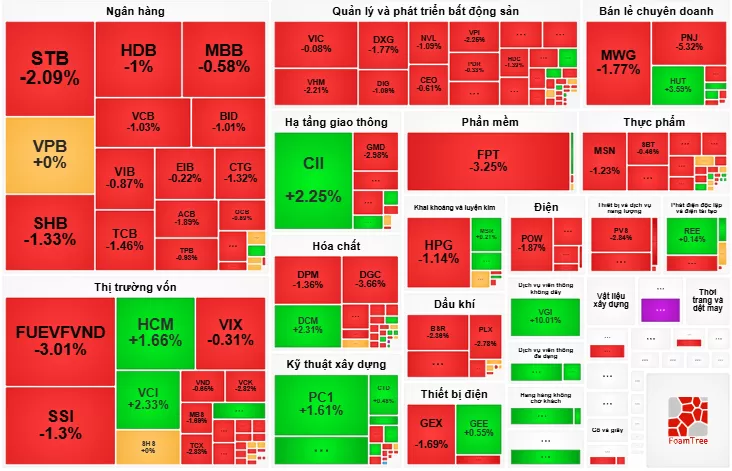 Trên bản đồ thị trường, không khó để nhận ra sắc đỏ bao trùm trên nhóm cổ phiếu vua, đa số giảm quanh mức 1 - 2%, như STB, SHB, HDB, VCB, BID, TCB, CTG, ACB… Tương tự là nhóm bất động sản với DXG, DIG, NVL, đặc biệt có bộ đôi VIC giảm 0.08% và VHM giảm 2.21%.