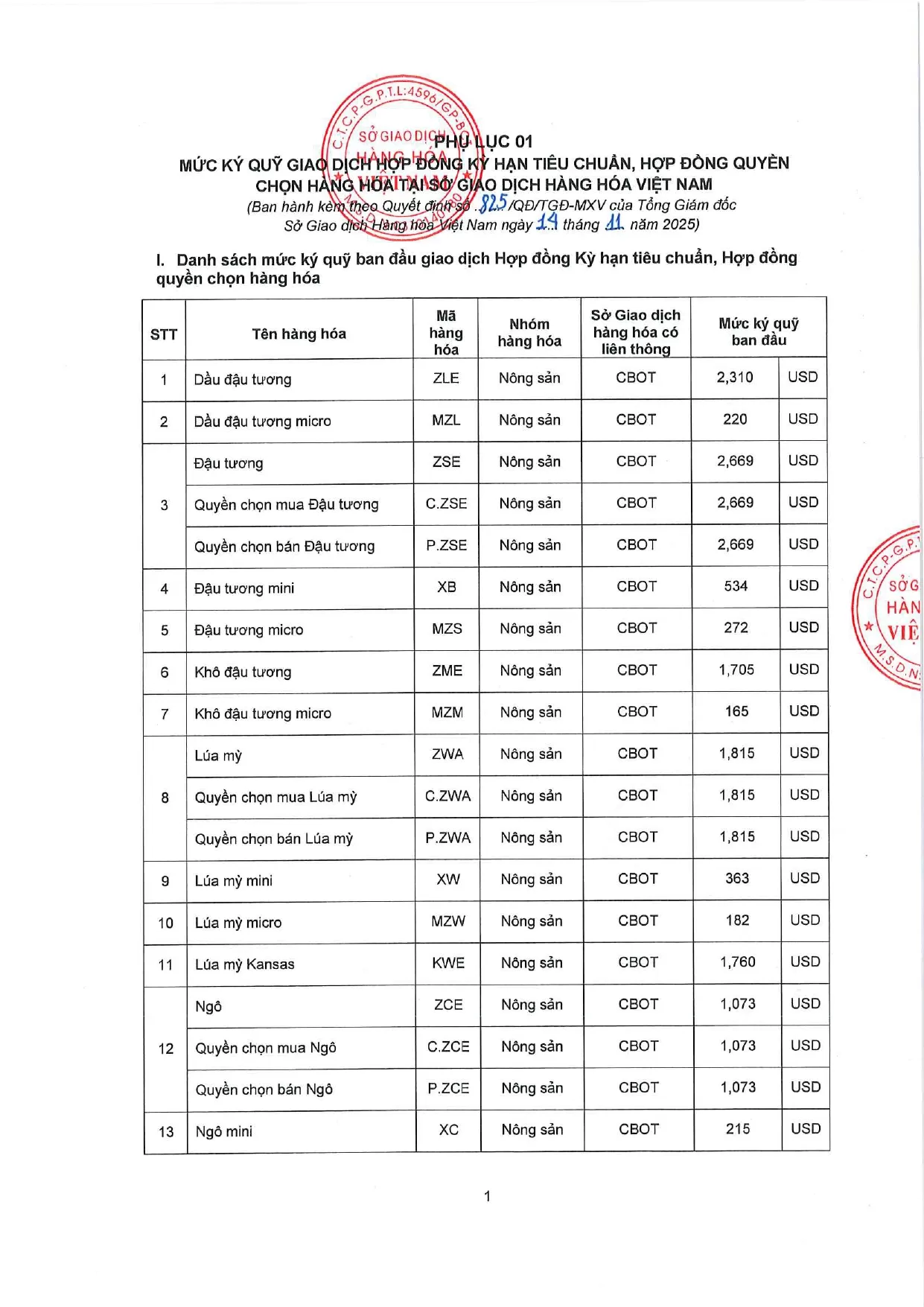 Áp dụng từ phiên giao dịch ngày 17/11/2025 và thay thế cho Quyết định số: 821/QĐ/TGĐ-MXV ngày 13/11/2025.